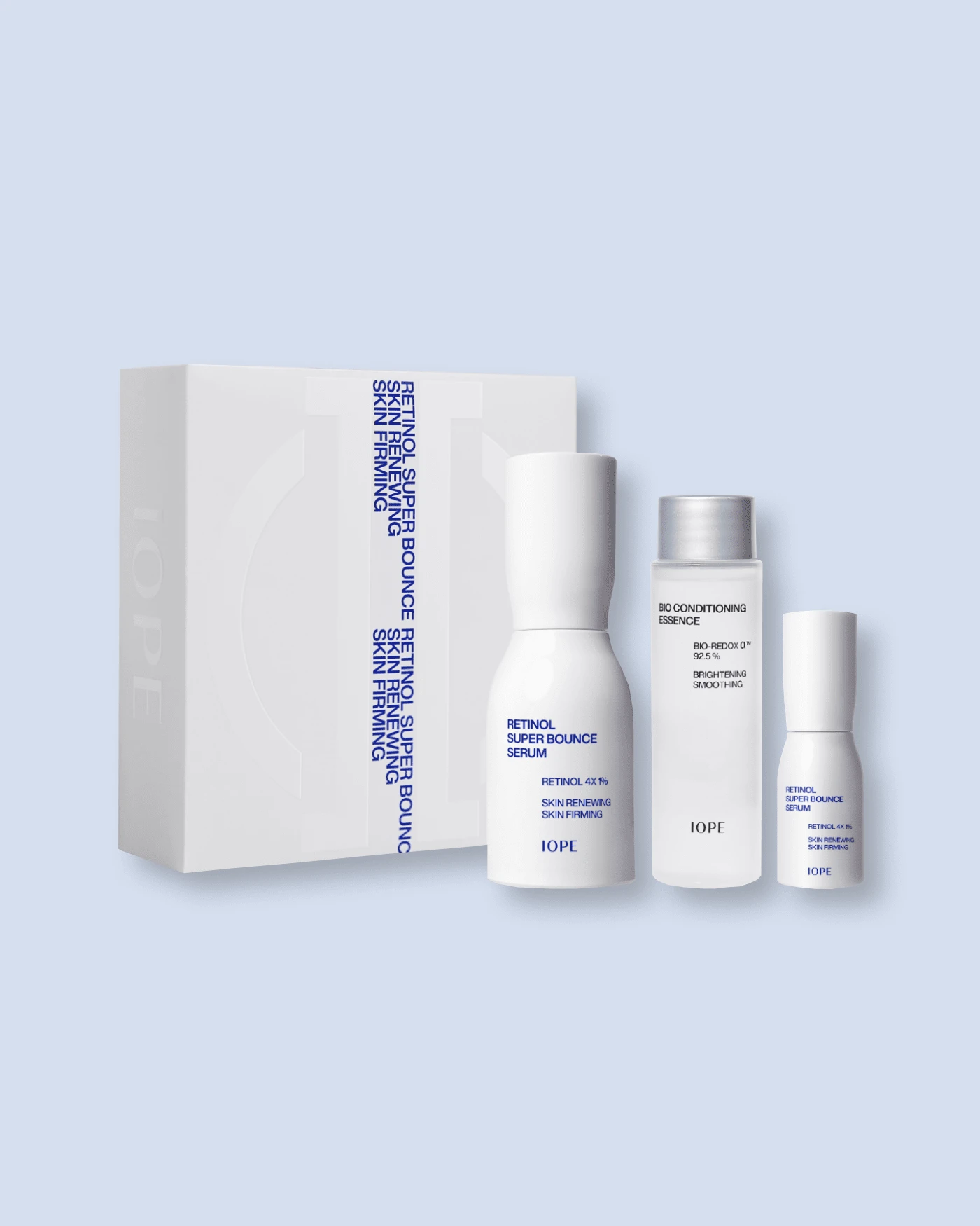 Introducing the IOPE Retinol Super Bounce Serum Set, featuring a full-sized 50 ml Retinol Super Bounce Serum, a travel-friendly 10 ml Retinol Super Bounce Serum, and an 84 ml Bio Conditioning Essence.