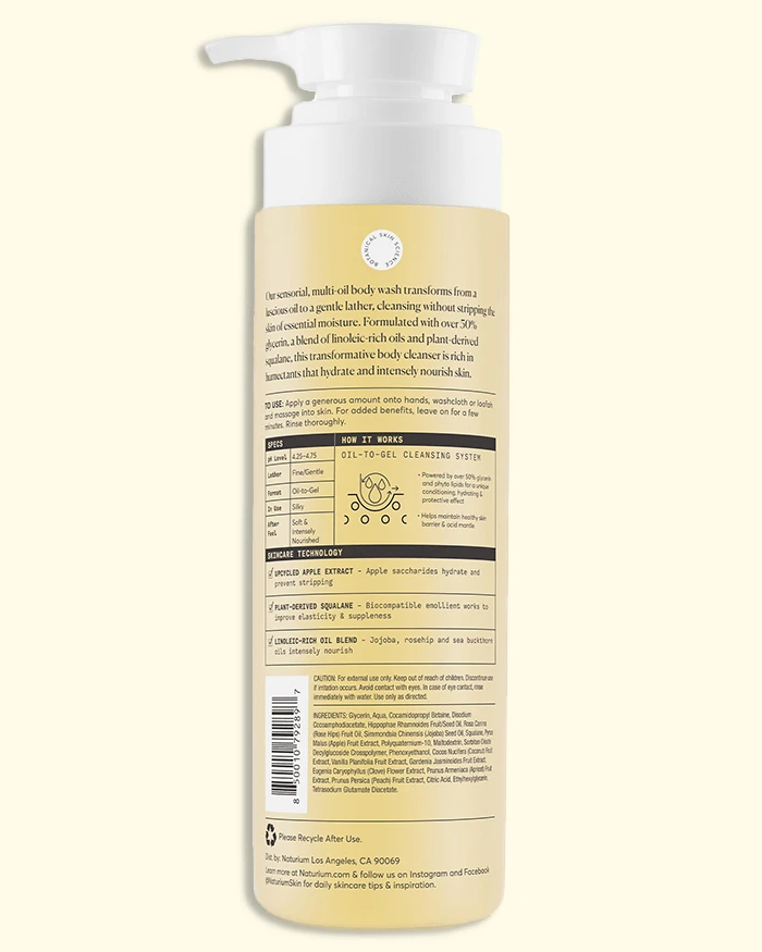 Taking their skin care expertise into body care, Naturium have formulated this body wash with over 50% glycerin, a blend of linoleic-rich oils and plant-derived squalane, which are rich in humectants that hydrate and intensely nourish skin. The oil-to-gel cleansing system is powered by over 50% glycerin and phyto lipids for a unique conditioning, hydrating & protective effect, that also helps maintain healthy skin barrier & acid mantle.Â