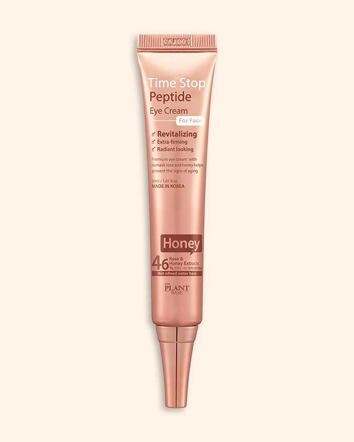 The Time Stop Peptide Eye Cream from The Plant Base is a rich cream that quickly absorbs, leaving skin nourished and hydrated without stickiness. This all-in-one cream is great for sensitive skin around the eyes but can also be used all over the face and on the neck for reducing the appearance of fine lines, wrinkles, and hyperpigmentation.Â